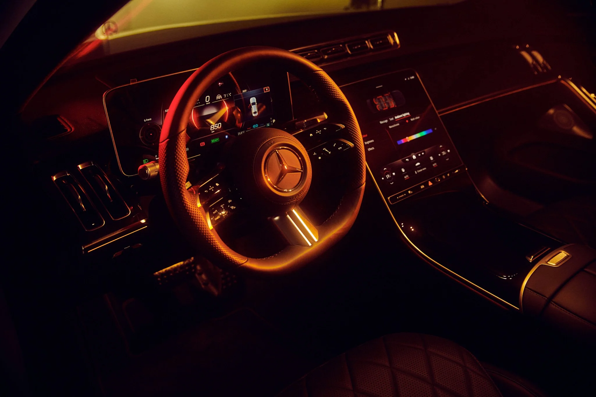 The interior of a luxury Mercedes-Benz car at night, featuring a digital dashboard display, illuminated steering wheel, and a central touchscreen with colorful display.