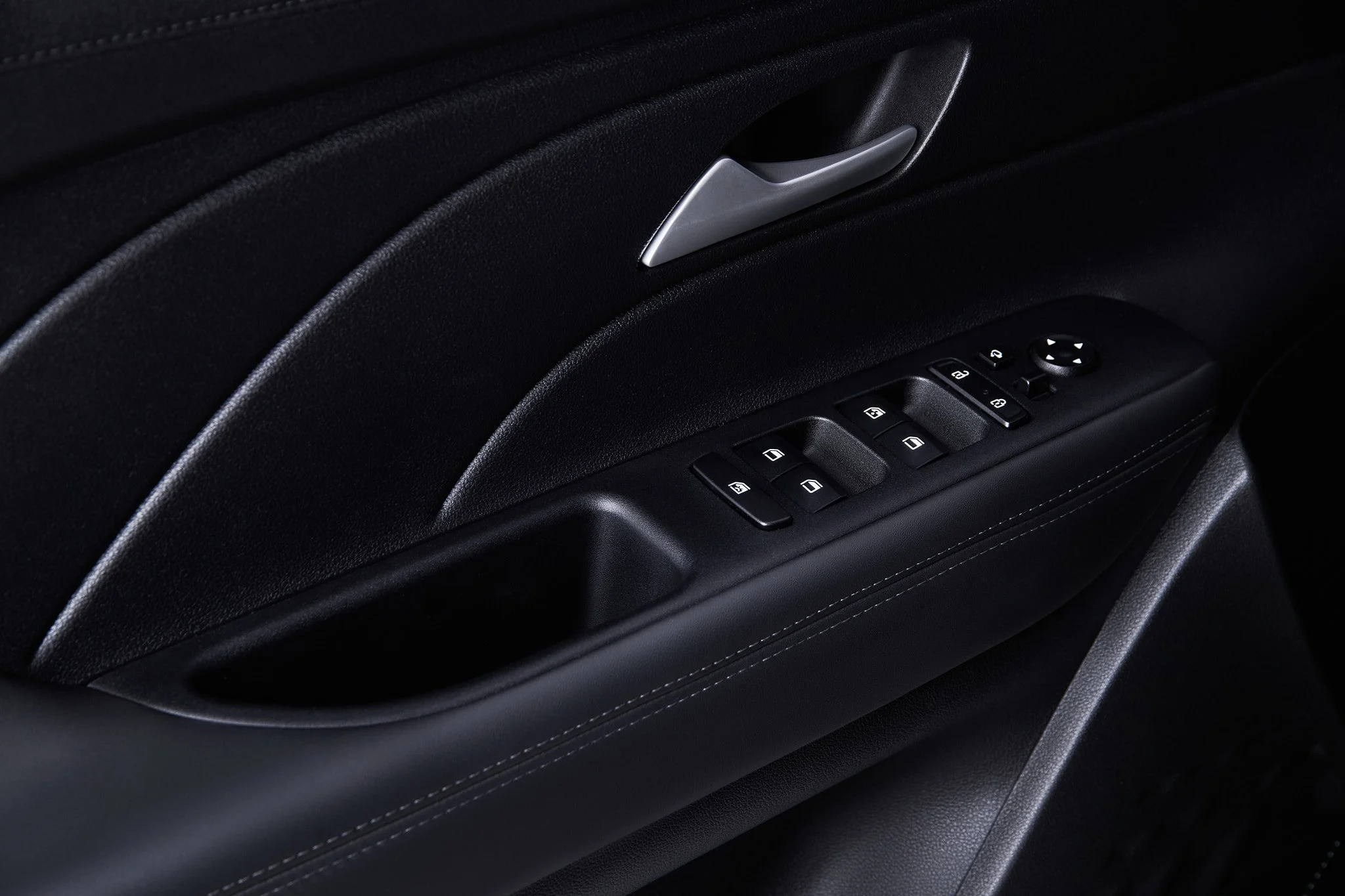 Close-up view of a car door interior including window control buttons, side mirror adjustment, and door handle.