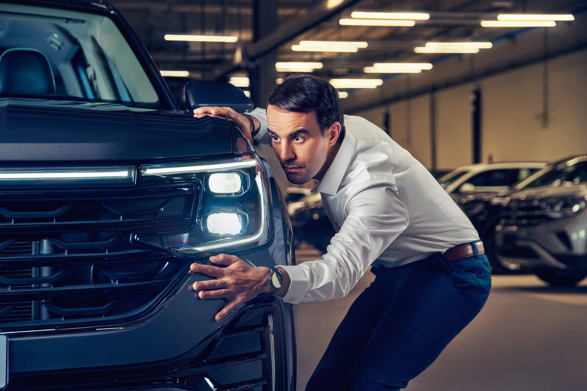 A mechanic inspecting the front of a dark gray Volkswagen SUV in an indoor garage, wearing blue overalls with a Volkswagen logo, with other cars in the background.