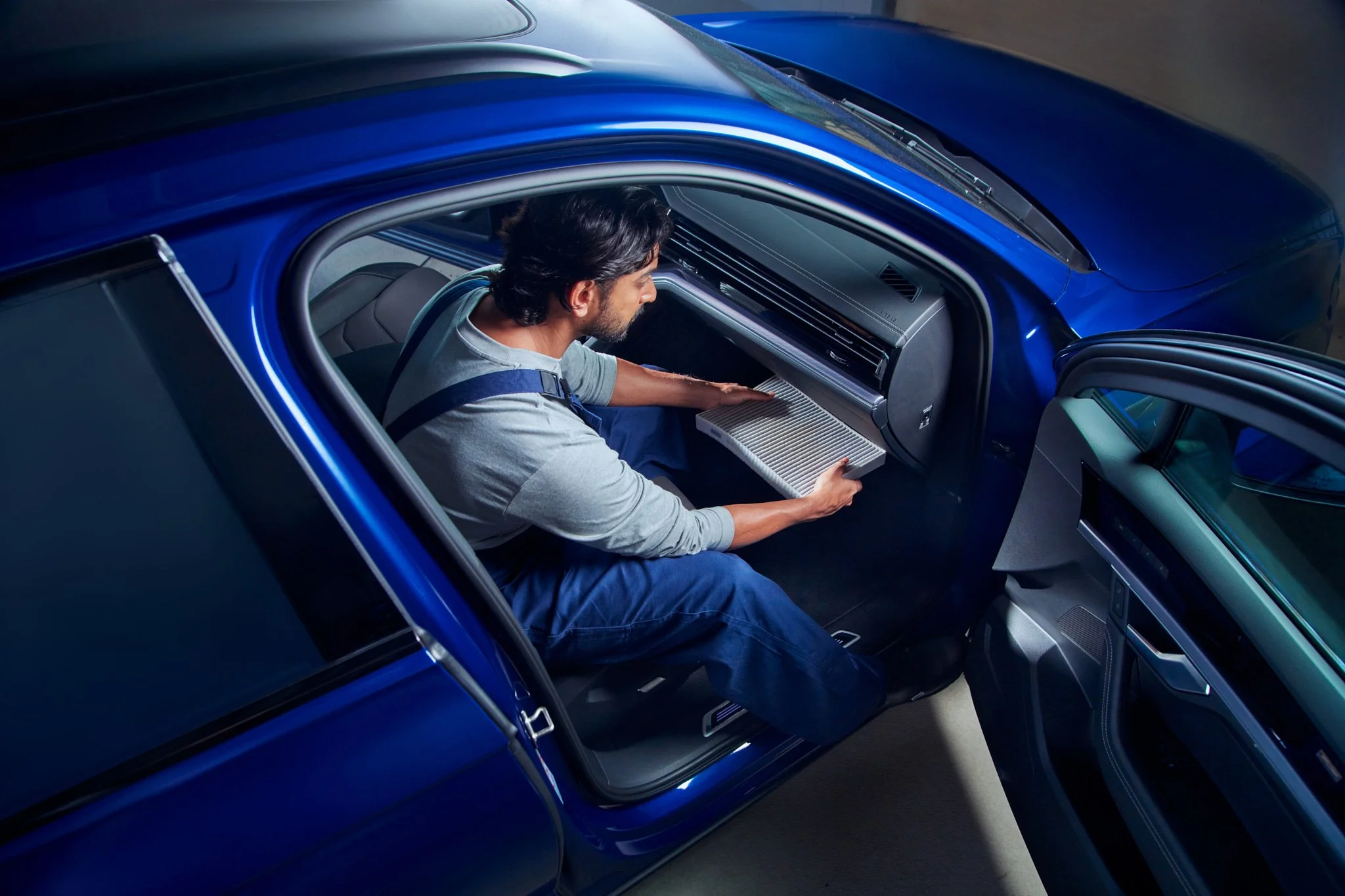 A man sitting inside a blue car, installing or inspecting an air filter with the car door open.