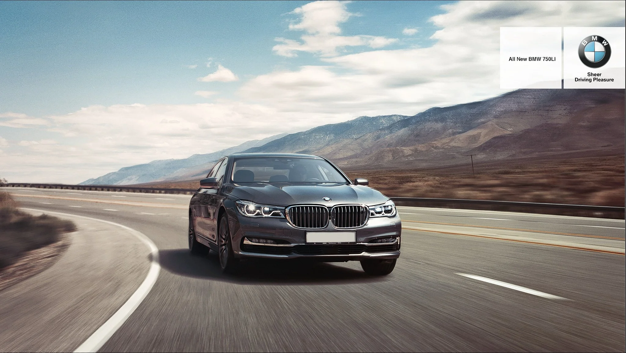 A black BMW 750LI car driving on an open, curved highway in a mountainous landscape with cloudy sky.