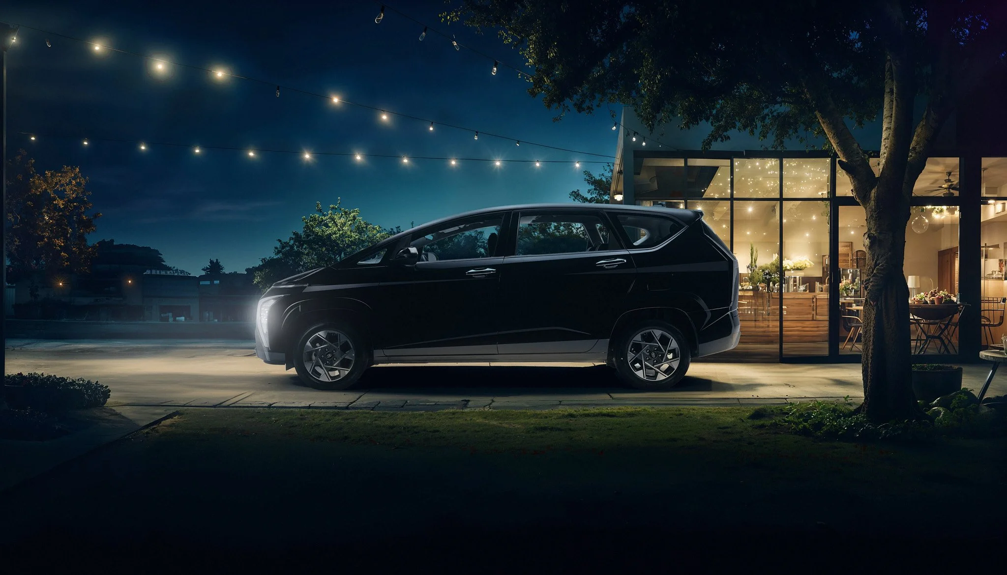A black SUV parked outside a well-lit modern house at night, with string lights hanging above and a tree in front.