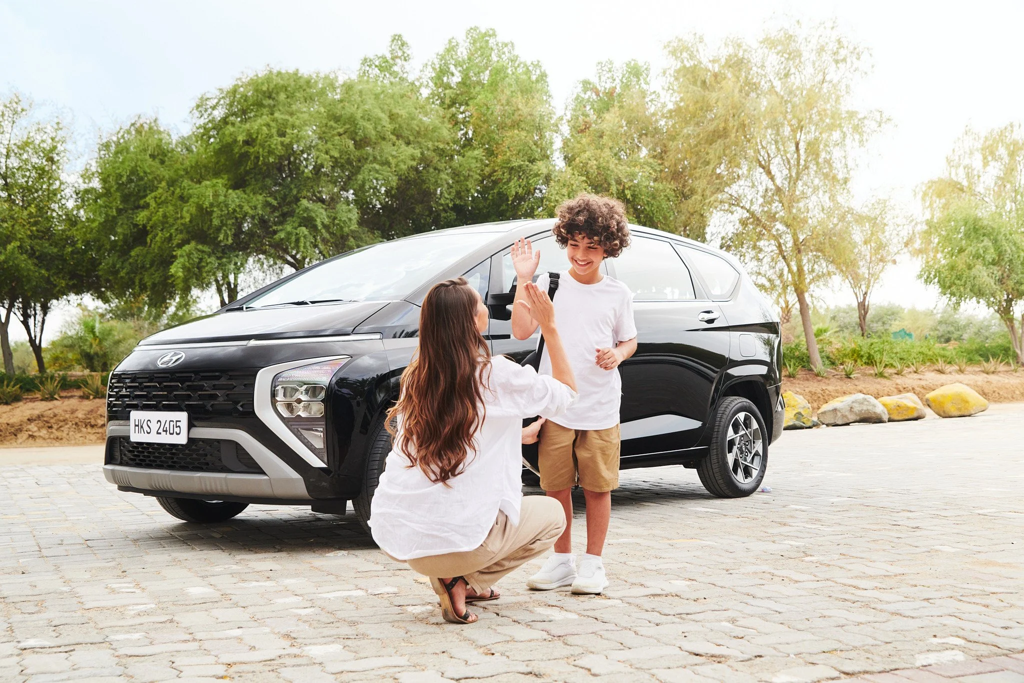 A woman and a young boy are outdoors, standing next to a black Hyundai SUV, giving each other a high five and smiling.