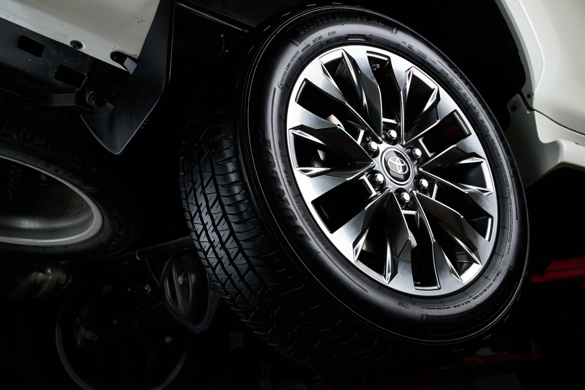 Close-up of a Toyota wheel with a shiny, multi-spoke alloy rim and a tire marked 'DUNLOP' in a dark environment.