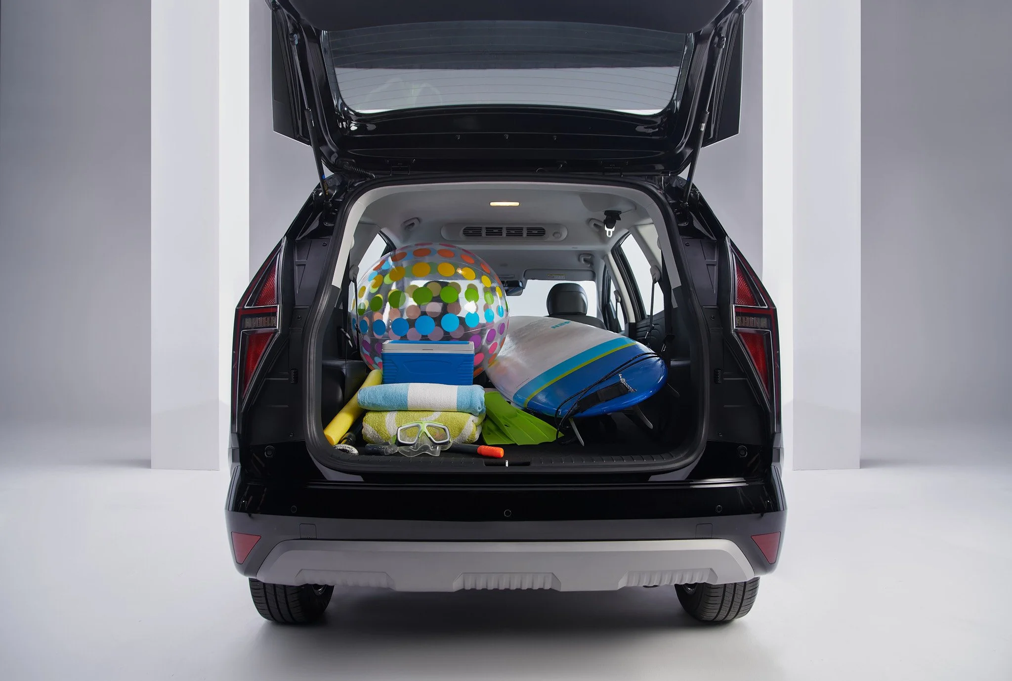 Open trunk of black SUV filled with summer gear including a beach ball, cooler, striped blanket, and folding chairs, against a plain gray background.